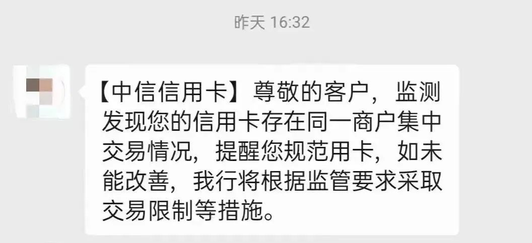 中信银行提醒:尊敬的客户,监测发现您的信用卡存在同一商户集中交易情况,提醒您规范用卡,如未能改善